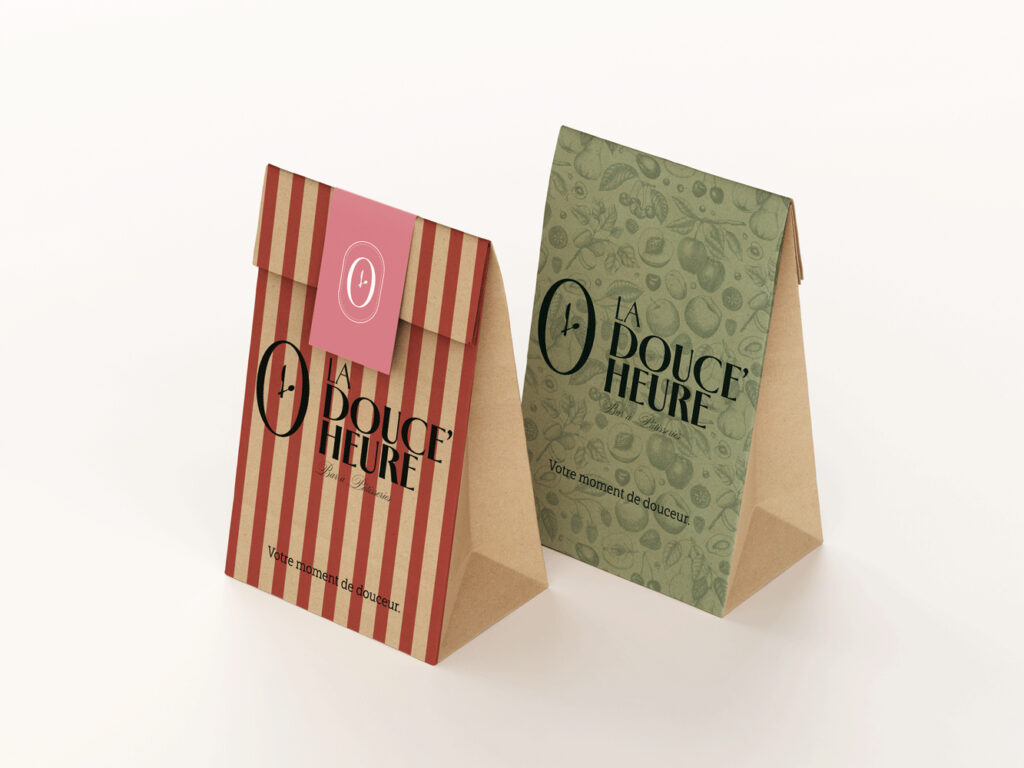 Projet de création d’univers de marque pour La Douce’Heure, un bar à pâtisseries de luxe, née de la volonté de sublimer un accessoire souvent négligé.